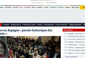 Si le hubieran dicho a Ada Colau hace unos meses que protagonizaría la portada digital del diario más leído de Francia se hubiera echado a reír incrédula. “Irrupción histórica de los ‘indignados'”, decía el rotativo a medianoche. Con una foto de Fabra i Coats, el local donde Barcelona en Comú celebraba los resultados, Le Monde hablaba de la derrota de los dos grandes partidos frente al auge de Ciudadanos y Podemos, a los que calificaba de ‘centro’ e ‘izquierda radical’, respectivamente. El batacazo del PP se debe para los franceses a los cuatro años “de austeridad y escándalos de corrupción, que también afectan al PSOE”.