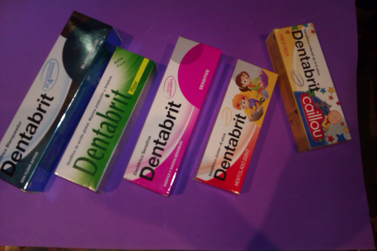 Dentabrit: Hacía años usaba esta marca, era de las primeras que te mandaba el dentista y tenías que ir a la farmacia a por ella...y ya por entonces era cara... ahora que la vuelvo a usar recuerdo la agradable sensación que dejaba en la boca.... He sido un poco infantil y estoy usando la de caillou jajja.