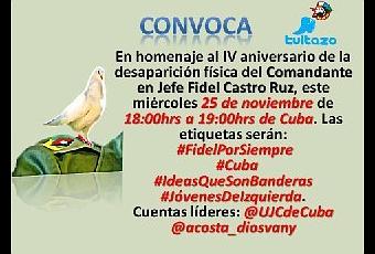 La Unión de Jóvenes Comunistas nos invita a participar en el tuitazo que se desarrollará mañana 25 de noviembre en el horario de 18:00hrs a 19:00hrs de #Cuba en homenaje al cuarto aniversario de la desaparición física del Comandante en Jefe Fidel Castro Ruz.