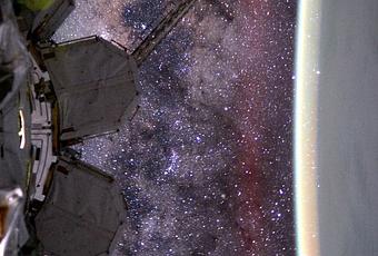 Hay fotografías que significan más para la humanidad desde fuera que desde dentro de nuestro planeta. Desde noviembre de 2000, ha habido personas que han vivido permanentemente en la Estación Espacial Internacional durante meses. Para celebrar el 15 aniversario de la humanidad fuera de la Tierra, se ha hecho esta instantánea de nuestra galaxia y de nuestro mundo posando juntos más allá de la estación. La Vía Láctea se extiende a la izquierda de la curva del limbo de la Tierra donde también hay un tenue color rojo, es la luminiscencia atmosférica. El bulbo central de la galaxia aparece con amplios campos de estrellas cortados por grietas de polvo interestelar que absorve la luz. La fotografía fue tomada por el astronauta Scott J. Kelly el 9 de agosto de 2015 durante una órbita al rededor de la Tierra, el día número 135 de su misión de un año en el espacio.