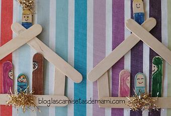 3. Ahora necesitamos hacer las figuras de nuestro Belén, para ello, partimos en dos los dos depresores que nos quedan (es importante tener en cuenta el tamaño de cada figura). Para vestir al niño Jesús utilizamos el trozo de lana que tenemos. A la virgen María, a San José y al angelito los pintamos con rotulador.