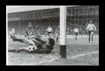 1979. El añorado portero lusitano Vítor Damas retiene un disparo del donostiarra Perico Alonso en un Racing-Real Sociedad, ganado por 1-0 por los montañeses.