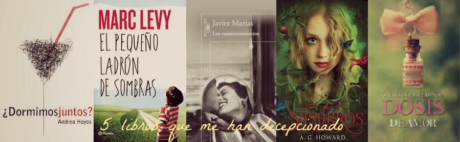 Letras desde Nivaria, donde hemos decidido copiar la idea original del blog The Broke and the Books pero con una lista de cinco. ¿De qué trata? Pues muy fácil una lista de cinco cosas relacionadas con la literatura directamente e indirectamente. La sección será cada jueves y por supuesto no es obligatorio seguir el blog para que la hagas en el tuyo.El tema de hoy es libros que te han decepcionado, ¡manos a la obra!1 Susurros - A.G. Howard: Deseaba tanto leerme este libro que después de leerlo solo deseaba que hubiese sido tan bonito como su portada. Eso sí, me gustó el principio y el final. 2 El pequeño ladrón de sombras - Marc Levy. Es una historia original, es cierto pero para mi se queda en eso, no me hizo sentir y se quedó como una lectura más. La verdad es que con poco libros he sentido tanta pena por no conseguir conectar como tantas personas habían hecho y es algo que me da mucha rabia.3 Dosis de amor - Milagrosa Nsue Rondo. La portada me gritaba ¡léeme! y mientras lo leía mi interior me gritaba, ¡venga, se valiente y termina de leerlo! Aunque es una historia original y tiene muchas cosas que me gustaron, termine enfadada con la protagonista y esto hacía que me costara leerlo.