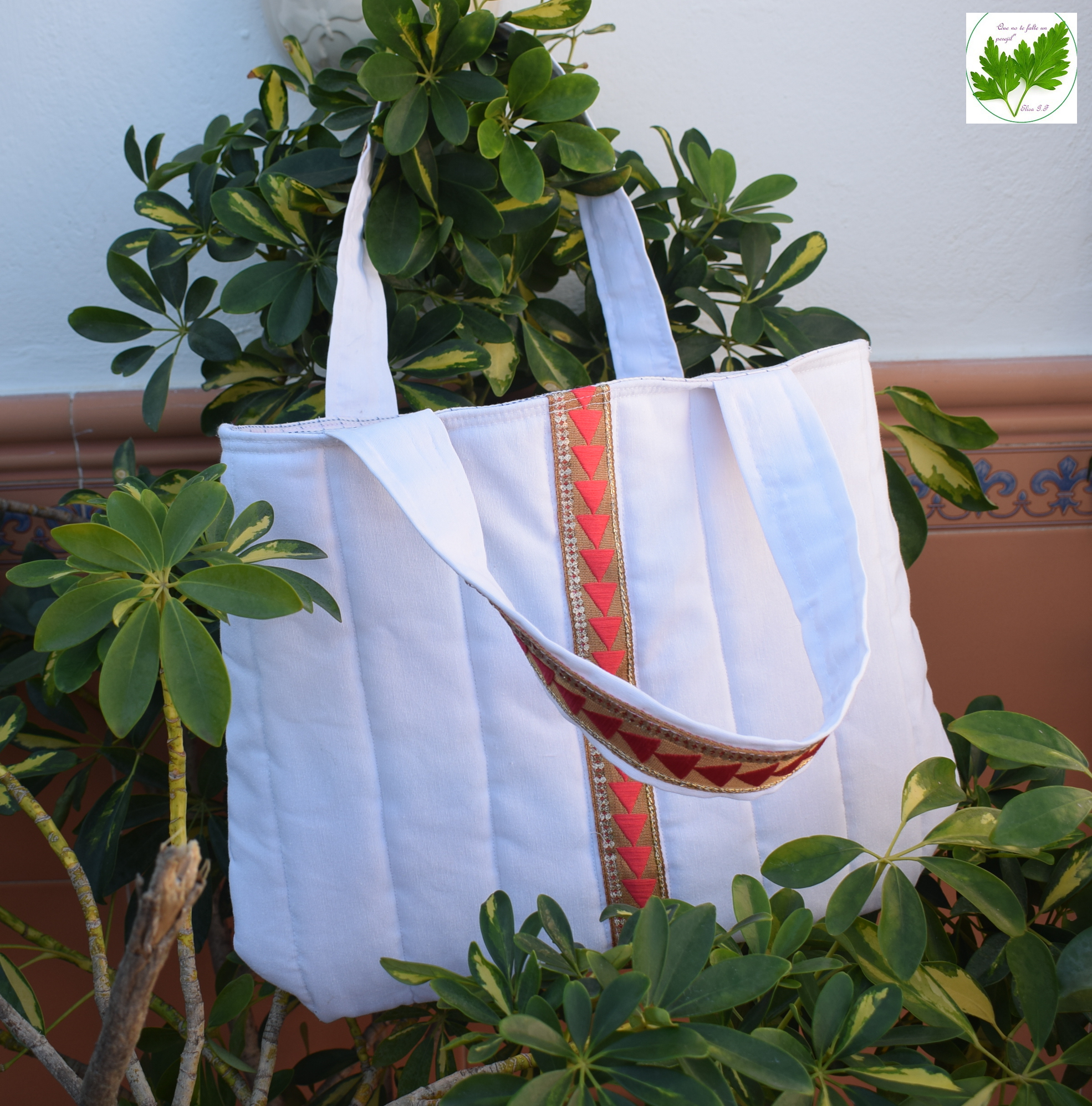Para hacer mi nueva bolsa he reutilizado una camisa de mi marido pasada de moda, sin embargo la tela estaba en perfectas condiciones y nada deteriorada. La tela exterior de la bolsa es un resto de loneta que me sobró después de hacer una cortina para una ventana. El adorno de la bolsa es una pasamanería sobrante de otra labor. Sólo tuve que comprar la guata interior para darle cuerpo.