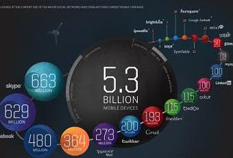 Cada “planeta” nos muestra el número de usuarios activos y cuántos de éstos acceden desde terminales móviles. Se calcula así la existencia de 5.300 millones de gadgets portátiles conectados en todo el mundo (un 77% de la población tiene uno). De éstos, un 21.8% son teléfonos inteligentes, predominando Nokia como fabricante más extendido.