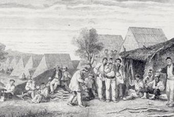 Grabado de la época que retrata la vida en una de las colonias penales de Nueva Caledonia