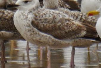 El grupo de gaviotas de hoy en Bañugues era bastante numeroso y a diferencia de días atrás tenía una proporción muy alta de juveniles de primer invierno, pero incluso en mitad del grupo la cáspica destacaba bastante.