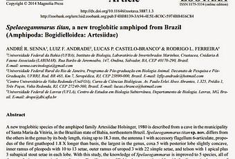 Se ha publicado hoy en la revista internacional de taxonomía ZOOTAXA, un nuevo trabajo sobre una nueva especie de anfípodo troglobio de Brasil. El trabajo se ha titulado: "Spelaeogammarus titan, a new troglobitic amphipod from Brazil (Amphipoda: Bogidielloidea: Artesiidae)" y firmado por André R. Senna, Luis F. Andrade, Lucas P. Castelo-Branco y Rodrigo L. Ferreira.