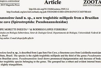 Si ayer comentábamos en este blog unas especies diplópodos nuevas descubiertas en cuevas de Croacia y de Montenegro, esta vez cruzamos el charco y nos vamos a América, concretamente a Brasil, donde se ha descubierto una nueva especie de diplópodos en cuevas de Brasil. El trabajo también ha sido publicado en la prestigiosa revista Zootaxa, denominándose: "Pseudonannolene lundi n. sp., a new troglobitic millipede from a Brazilian limestone cave (Spirostreptida: Pseudonannolenidae)", cuyos autores son LUIZ FELIPE MORETTI INIESTA y RODRIGO LOPES FERREIRA. Al igual que el anterior trabajo, no está de libre acceso y sólo se pueden ver algunas páginas en la web: http://www.mapress.com/zootaxa/2015/f/z03949p128f.pdf Enhorabuena a los descubridores y a los autores de este trabajo.