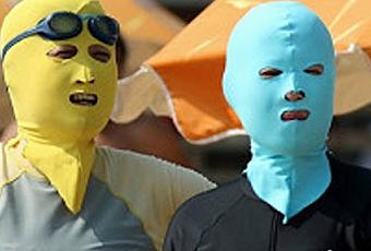 Estos chinos, no muy amigos del sol, han bautizado sus atuendos como carakinis, ya que les protegen el rostro de quemaduras solares. En realidad para eso fueron diseñados, pero resulta que también sirven para proteger a los bañistas de picaduras de medusas e insectos.