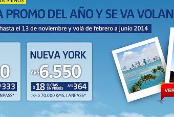 Bajo el lema de "Llegó la promo del año y se va volando", LAN anuncia en su sitio web (lan.com) pasajes baratos para volar no sólo a Miami y Nueva York, sino también a destinos de Europa como Madrid, Milán, París y Londres.La tarifa para viajar a Miami es de $5.990 final, un precio díficil de encontrar en otro momento del año. Y con la posibilidad de acceder a 18 cuotas sin interés si se tienen tarjetas Visa y/o Master del Banco Francés BBVA. Una oportunidad muy interesante.