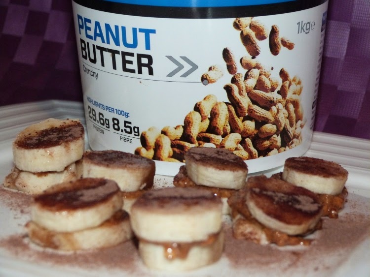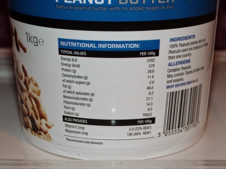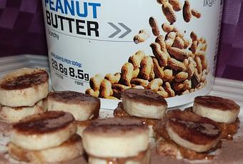 La receta (es tan fácil que llamarlo receta me parece demasiado...) se basa en la mantequilla de cacahuete (Peanut Butter) un alimento ADORADO por los deportistas de todo el mundo.Por supuesto que no vale cualquier marca que os podéis encontrar ya que las más comerciales tienen azúcar añadido y conservantes...para estas cosas no te lo pienses, yo he utilizado esta Mantequilla de cacahuete sin sal ni azúcar añadidos de la web MyProtein . Solamente contiene cacahuete...¡es la mejor!Aquí tenéis su composición, efectivamente es muy alta en calorías. Es normal ya que lo que se busca es utilizar este snack como alimento para antes de hacer ejercicio (aporta una inyección de energía brutal) y de verdad que llena muchísimo, con dos o tres bocaditos (¡muy ricos por cierto!) tendrás suficiente.Su grasa monoinsaturada además, ayuda a disminuir el riesgo de desarrollar enfermedades del corazón, es una gran fuente de hierro que ayuda a mantener una buena circulación....Vamos, que en cantidades pequeñas se puede añadir a cualquier dieta y es un alimento muy bueno, eso sí, mejor para deportistas.
