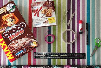Una caja de cerealesPegamentoTijerasPapel de regaloCinta de regaloUn lápiz o rotuladorUna regla