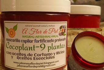 Mascarilla Capilar Fortificante Prelavado COCOPLANT-9 PLANTAS Con aceite de Cartamo y Ricino además del de Coco,claro;aceites esenciales de limón,pomelo,naranja,extracto de romero y albahaca,cosecha de mi jardín,lavanda,azufaifo,tomillo,rosas,calendula,raíz de gengibre y ajo rojo. Nutre y alisa la fibra capilar,regenera,actua contra la caida y la caspa y previene,calma y contribuye al crecimiento del cabello,con un uso regular devolverá la salud natural del cabello. 200ml-7€