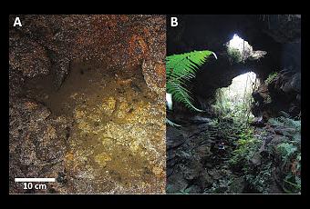 Figure 2. A Drip pool in dark zone of Cueva Chato 2 (Santa Cruz Island, Galápagos Islands, Ecuador), where Pseudosinella vulcana sp. n. was collected from surface film. Photo by SJT, 15 March 2014 B Entrance of Cueva Cañón (Santa Cruz Island, Galápagos Islands, Ecuador), where Lepidocyrtus nigrosetosus was collected. Photo by SJT, 10 March 2014.En este fascinante trabajo se hace referencia de nuevas citas y de la descripción de nuevas especies para la ciencia de diminutos invertebrados: los colémbolos.