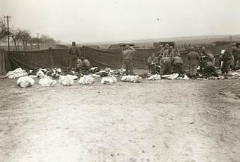 Soldados norteamericanos y alemanes antes de ser enterrados por por prisioneros de guerra.