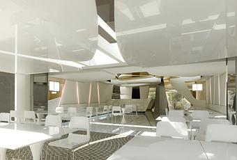 Los sinuosos techos simbolizan las burbujas del champán con un acabado dorado brillo y se ha ampliado visualmente el espacio con un acabado en blanco y reflejos, que trasladan la imagen que se observa a través de una copa de champán al espacio.