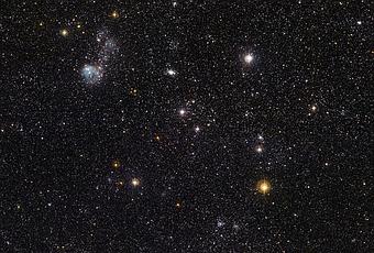 Arriba: Imagen detallada de la Gran Nube de Magallanes, tomada con el instrumento Cámara de Campo Amplio (Wide Field Imager, WFI). Crédito: Observatorio La Silla de ESO en Chile.Los cúmulos globulares (un grupo de cientos de miles a millones de estrellas juntas por atracción de la gravedad en un patrón esférico) están presentes en la GNM y uno es visible en la parte superior derecha, que se ve como un óvalo difuso. Su nombre es NGC 1978 y se trata de un cúmulo globular masivo, pero que se cree que tiene una edad de 3,5 mil millones de años. Esto lleva a pensar a los astrónomos que la GNM tiene una reciente historia de formación estelar.