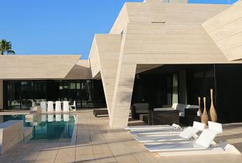 El blanco y el negro se adueñan del conjunto creando contrastes y abriendo mediante grandes ventanales la vivienda al exterior. En el entorno circundante destaca la piscina, de grandes dimensiones.