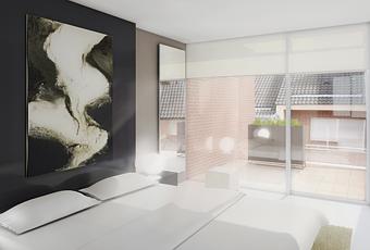 Como mobiliario se ha introducido una cama Capri con un cabecero en blanco que continua su camino hasta el techo, y en el que podemos ubicar un cuadro de Mercedes Rodriguez.