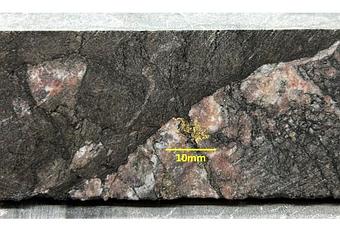 El sondeo AIG-23-13 se perforó en el mismo lugar con un ángulo de caída más pronunciado de 10 grados. El mismo dique de lamprófiro alterado y cizallado se intersectó desde la superficie de la roca a 20,8 metros hasta una profundidad de 43 metros. Se puede calcular un intervalo de 15,36 g/t en 7,05 metros incluyendo una zona de enriquecimiento de 103,86 g/t en 1 metro basada en la continuidad del sistema de alteración y cizalla de feldespato-carbonato-carbonato. La mineralización se presenta en forma de partículas de oro libres que alcanzan un tamaño milimétrico, localmente concentradas en grupos.