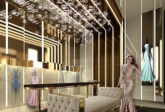Los percheros comparten el concepto escultórico de la lámpara, convirtiéndose en piezas de diseño que se elevan desde el suelo, formando líneas sinuosas y marcadas curvas. Finalmente, los muros cuentan con un acabado espejado para dar mayor sensación de amplitud al espacio.
