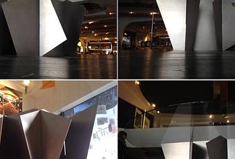 El pedestal se compone de 5 láminas de acero de 127x74cm que siguen un mismo diseño geométrico. Estas 5 láminas cuentan con puntos de unión diferentes, logrando que una misma forma de lámina se convierta en 5 elementos diferentes, creando una composición de planos que parecen mostrar piezas completamente distintas.