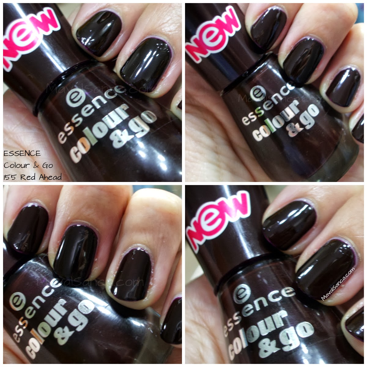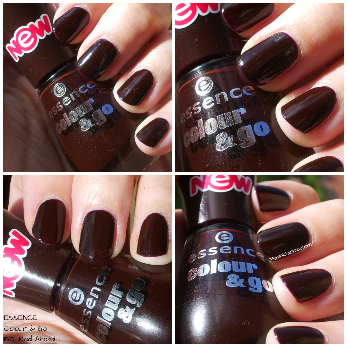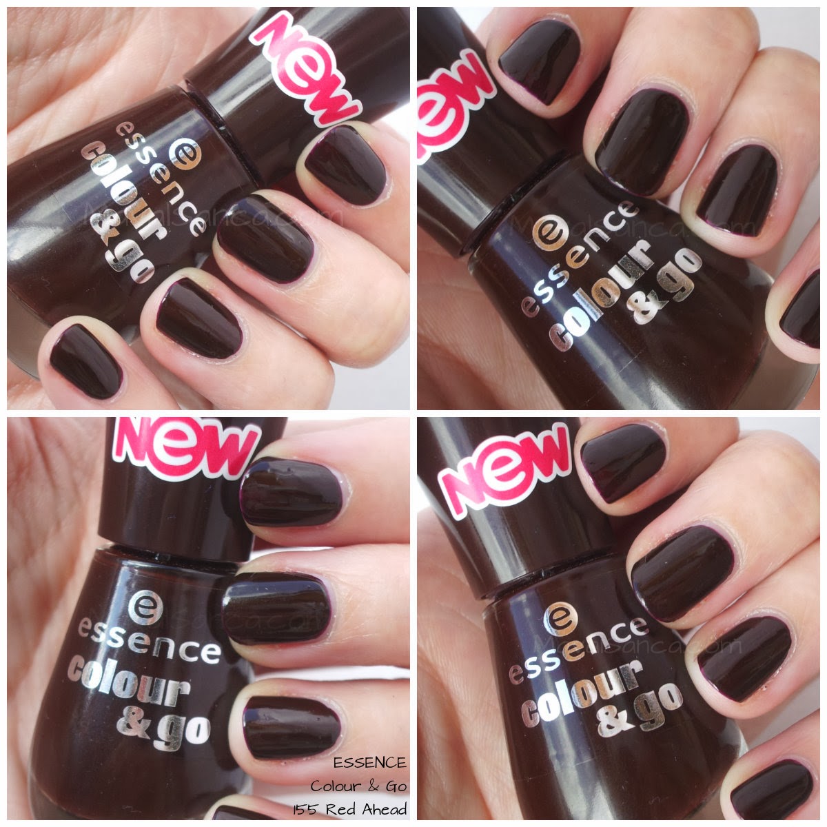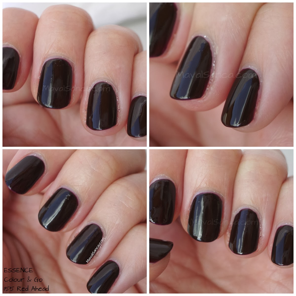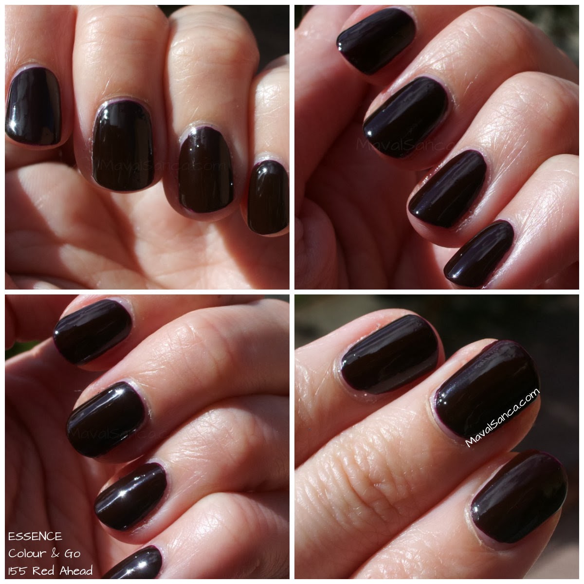 In these photos of ESSENCE Red Ahead nail polish taken with artificial light and with flash so you can see how the nail polish is garnet.