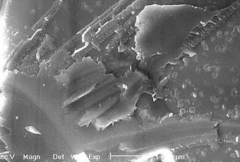 Los complejos biomorfos aparecen en otro meteorito marciano, en el meteorito de Nakhla. La imagen fue obtenida con un microscopio electrónico de barrido. Esta imagen contiene tres formas básicas: estructuras suaves en forma de cuchillo, formas alargadas con cápsulas redondeadas y estructuras transversales o tabiques, además de pequeñas formas parecidas a rosquillas, cada una de alrededor de 1 micrómetro de diámetro. Una posibilidad es que estas estructuras en forma de rosquilla se deriven de las estructuras alargadas o tabiques. (Crédito: NASA / David McKay)Mediante el uso de los instrumentos analíticos más avanzados actualmente disponibles, un equipo del Centro Espacial Johnson ha reexaminado el descubrimiento de 1996 que afirma que un meteorito marciano contiene fuertes evidencias de que la vida existió en el Marte primitivo.