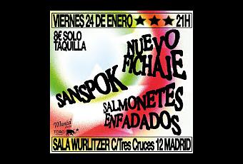 Triple concierto a la vista en Madrid con propuestas emergentes que estarán en Wurlitzer Ballroom para presentar sus canciones. Será una gran ocasión de ver a estos tres buenos proyectos que están creciendo, nos referimos a Sanspok, Nuevo Fichaje y a Salmomentes Enfadados.Sanspok son una banda llena de canciones interesantes que llegan desde Castellón, en este caso empezando el 2025 con unas canciones nuevas que se unen a parte de su repertorio publicado.Nuevo Fichaje son una banda que han ido recorriendo las salas y que están en un gran momento, os recomendamos descubrirles. Salmonetes Enfadados son una banda de Getafe que están dando pasos de gigante y que ofrecen algo distinto, mucha actitud y mucho que mostrarnos, os recomendamos escuchar sus temas y verles en directo.