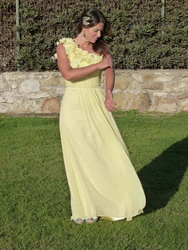 Esta vez, como era en la playa, me puse unas cuñas (que me vino genial para el baile) y busqué un accesorio para el pelo un poco llamativo.