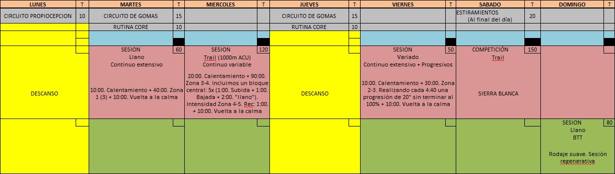 Además, guardaba muchos buenos recuerdos de la anterior edición, la I CxM Sierra blanca y quería aprovechar toda la experiencia acumulada durante el pasado año para disfrutar más del bello pero exigente trazado de la prueba; por ello que el objetivo esta semana fue recuperar y entrenar de cara para la competición, sin descuidar el objetivo a medio plazo, sub 13 horas en la próxima edición de los 101 km de Ronda 2015 (a falta de que baje 312 puestos la lista de espera).Lunes - Descanso + 10' de circuito propioceptivo