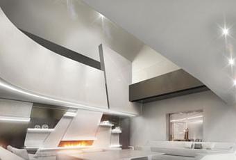 En la sala de estar a doble altura se mantiene el dinamismo a través del diseño curvo de elementos , materiales blancos y el protagonismo del propio ambiente frente a elementos decorativos externos. Se utilizan los materiales antes mencionados y se integra un mobiliario en consonancia a las propias formas y diseño de la vivienda. La estancia está conectada a un patio interior y las zonas comunes del exterior gracias a la apertura de amplios ventanales.