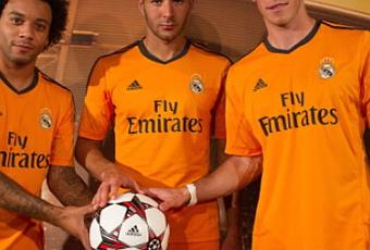 Real Madrid presentó oficialmetne su tercer uniforme Adidas, de color naranja, para disputar la Champions League en esta temprada 2013-2014, en un evento donde estuvieron presentes Marcelo, Karim Benzema, y el nuevo refuerzo “Merengue”, el galés Gareth Bale.