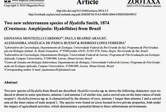 ABSTRACT:Two new species of Hyalella from Brazil are described. Hyalella veredae sp. n. shows the following characters: eyes reduced or absent in some specimens; antenna 1 and antenna 2 of similar size, and a curved seta on the inner ramus of male uropod 1. Hyalella formosa sp. n. is characterized by the absence of eyes, antenna 1 longer than antenna 2 and a curved seta on the inner ramus of male uropod 1. The species were found on caves located in two private properties, both under the impact of agricultural activities, which demonstrates a potential threat to these subterranean environments