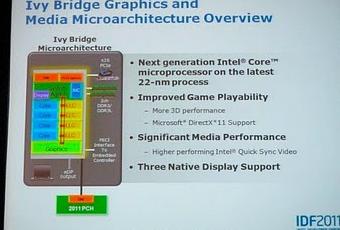 Además del número de transistores, Intel ha mostrado la arquitectura de Ivy Bridge, la cual tenéis en la imagen superior, y que traerá GPU con DirectX 11 y una mejora en el rendimiento, algo evidente debido a la reducción del proceso de fabricación.