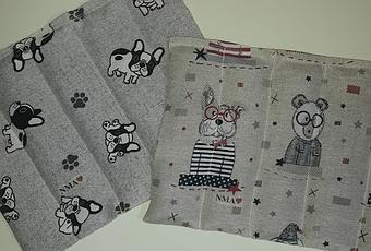 Uno con una bonita tela de bulldogs con fondo gris y la otra con gatitos, conejitos, perritos... muy guapitos y bien vestidos.
