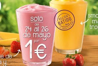 Si quieres probar las nuevas bebidas de Burger King, los próximos 24, 25 y 26 de mayo encontrarás los smoothies de fresa y plátano o mango y tropical por solo 1€. Como ves, estamos hablando de frutas totalmente refrescantes. Ten en cuenta que el precio recomendado del tamaño pequeño es de 2,49€, con lo cual la oferta de lanzamiento es más que interesante. Sin duda es una ocasión para ir con los más pequeños y probar un producto nautral y refrescante en familia.