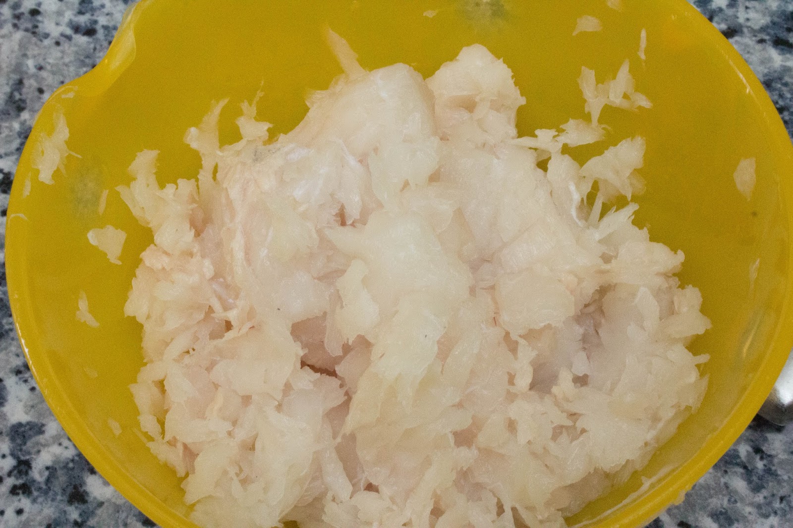 Quitar la piel y las espinas de la merluza, luego desmigarla un poco y echarlo a un bol.