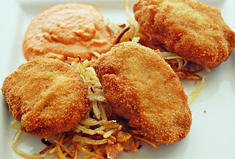 Se fríen los nuggets en abundante aceite caliente. (Se pueden acompañar con salsa césar, barbacoa, alioli o kétchup).