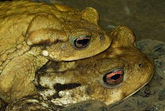 Pareja de Sapo común en amplexusPero estas lluvias no han sido mal recibidas por todos. Muchos animales las esperaban ansiosos, ya que las largas semanas sin precipitaciones habían secado las charcas y fuentes donde acuden a reproducirse en esta época del año. Multitud de anfibios, como los Sapos comunes (Bufo spinosus) o las Ranas bermejas (Rana temporaria) se dirigen por millares estos días a las masas de agua recientemente formadas para aparearse.