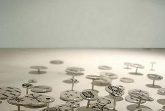 En sus creaciones utiliza aluminio serigrafiado, resina, esmalte, cobre, plata, latón...