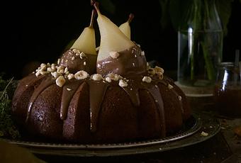 - Spread Nutella ganache on top of the bundt cake and decorate with the poached pears dipped into the chocolate ganache as well.
