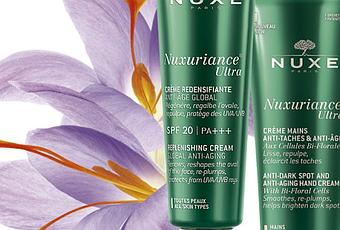 Nuxe aumenta su gama antiedad Nuxuriance® Ultra, sumando a la familia dos nuevos productos enriquecidos con Células Bi-Florales® de Azafrán y Buganvilla: por un lado una Crema de Manos Anti-edad y Anti-manchas, que promete alisar, redensificar y aclarar las manchas de las manos; por otro lado la Crema Redensificante Anti-edad Global SPF20 PA+++, una auténtica revolución anti-edad que actúa de forma específica en las células principales de la piel.