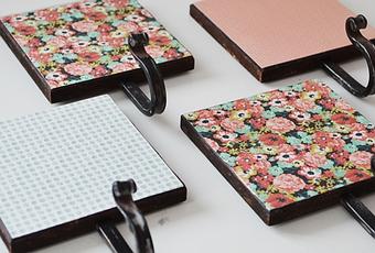 Magui tenía un set de percheritos que ya la habían cansado. Tenían un papel "simil maderas recuperadas" y formaban la palabra HOME, esas cosas simpáticas madeinchina que podemos encontrar en varias tiendas de decoración. Con mi pila de papeles desplegada en la mesa (saben que además de ser fan de las maderas soy fan de los papeles, no?!) elegimos tres diseños distintos como para armar un composé... y me encantó como quedó! A ellas también :)