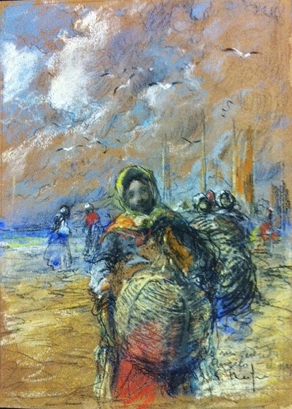 De nuevo tenemos que agradecer las imágenes que dos lectores de este blog nos envían desde Palma de Mallorca. Se trata de dos preciosos dibujos que pertenecían a un coleccionista mallorquín y que por vías diversas han sido recientemente vendidos. Las dos obras, de calidad y tamaño similar, representan, la primera, a una campesina con un cesto y, la segunda, a una mujer en una playa portando una nasa. Realizadas en lápiz, carboncillo y pastel, están firmadas y dedicadas. Al tratar de establecer una datación a las mismas, nos encontramos con las habituales dificultades que tantas veces hemos expuesto. Meifrén dejó de fechar la mayoría de sus obras a partir de finales del siglo XIX. Tal como comentamos a los propietarios de las mismas, hemos intentado encontrar referentes o similitudes con otras obras del autor. Aquí también les hemos recordado que en la época en la que situamos estos dibujos, hacia 1900, un Meifrén viajero, reconocido y laureado, domina totalmente las técnicas del dibujo, acuarela y óleo, pero el público, sin embargo, le reclama principalmente estos últimos. Las obras que estamos tratando, y que corresponden a este periodo de vida del artista, constituye un claro ejemplo de su virtuosismo. Curiosamente Eliseo Meifrén, cuya producción de dibujo es muy abundante, no se prodiga en colorear los mismos, y lo más probable es que sea la preferencia del público antes descrita la que haya que este tipo de obras sea más bien escasa.