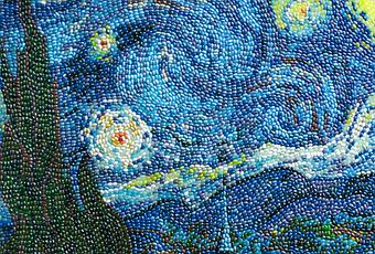 Utilizando grageas de 50 sabores (y los colores para distinguirlas), se consigue una paleta de colores de caramelo tan extensa como para pintar las obras de artistas tan diferentes como Van Gogh, Leonardo Da Vinci, Hokusai o Johannes Vermer. Este arco iris de sabores sirve para componer imágenes que sonrojarían a cualquier caja de lápices o rotuladores.