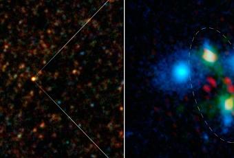 Las galaxias están a 11.000 millones de años luz de la Tierra, cuando el Universo tenía unos 3.000 millones de años. Al principio los astrónomos pensaron que la imagen que recibían era un reflejo fantasma de una sola galaxia, sin embargo tras mayor investigación, se dieron cuenta que en realidad estaban observando la fusión de dos galaxias. Luego notaron que entre ambas estaban creando 2.000 estrellas por año – muchísimo en comparación a la Vía Láctea por ejemplo, que crea unas tres por año.