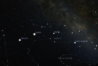 Primero los buscamos en el cielo, son dos puntos muy brillantes casi sin parpadeo, el más brillante es Júpiter y un poco menos Saturno con un tono un poco verdoso, pero eso ya lo ven las personas que tienen muy aguda la vista, usamos el programa stellarium para encontrarlos, aunque allí en nuestro observatorio entre miles de estrellas los veremos muy claramente. La fecha la que queramos pero siempre claro que se puedan observar, en este caso es en el mes de julio sobre las 23:00h