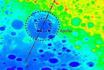 Afortunadamente, un cráter con la edad de la cuenca del polo sur Aitken puede proveer una vista de esas características. Denominada Cuenca de Apolo y formada por el posterior impacto de un asteroide más pequeño, aún mide unos 480 kilómetros de diámetro.